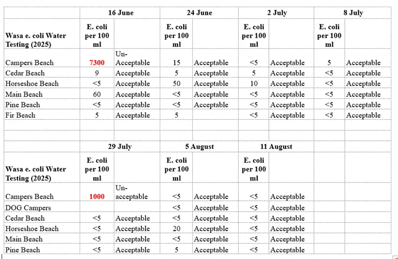Two recent spikes in E. coli readings from Campers Beach, one June 16 (7300 E. coli per 100 ml) and the other July 29 (1000 E. coli per 100 ml), have residents asking questions about what’s causing it, why it’s happening, especially before a long weekend? What’s the source? What can be done to fix it?